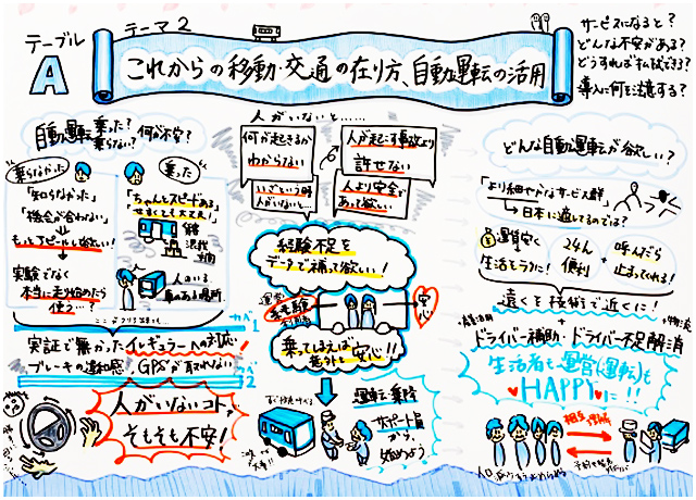 参加した市民の理解促進を図ることを目的に、議論の内容を視覚的な表現でその場で記録する“グラフィックレコーディング”を実施しました。